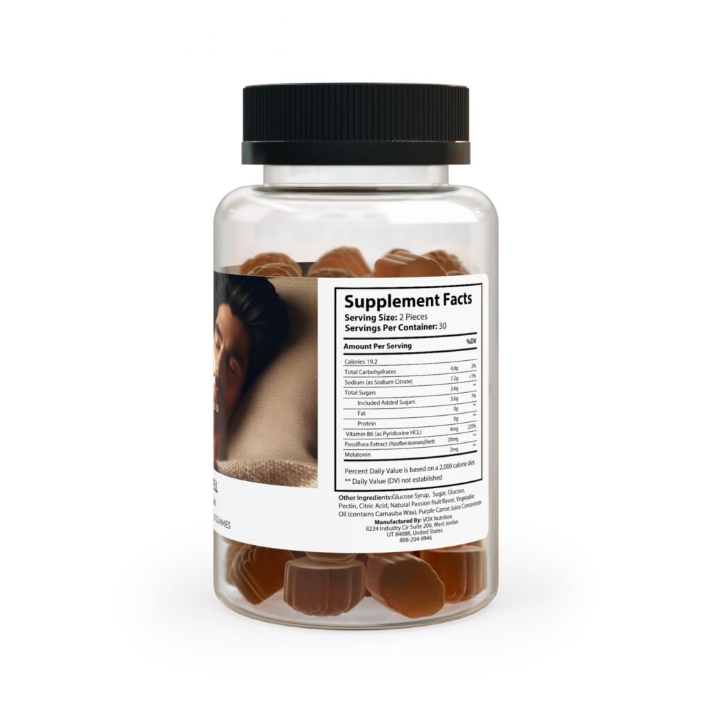 Ingredients: Sodium (as Sodium Citrate), Vitamin B6 (as Pyridoxine HCL), Passiora Extract (Passiore incarnata)(herb), Melatonin. Other Ingredients: Glucose Syrup, Sugar, Glucose, Pectin, Citric Acid, Natural Passion fruit avor, Vegetable Oil (contains Carnauba Wax), Purple Carrot Juice Concentrate