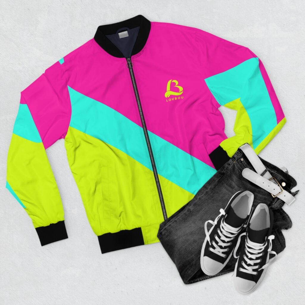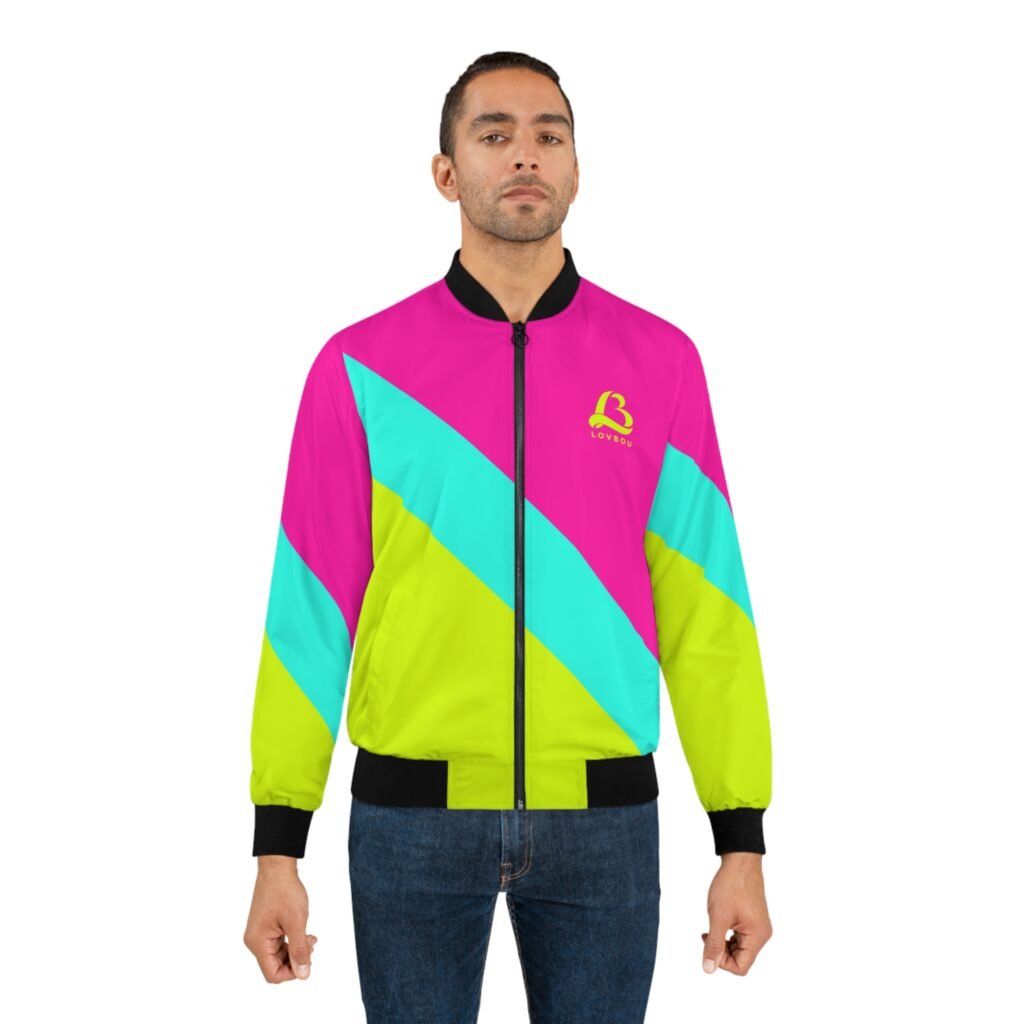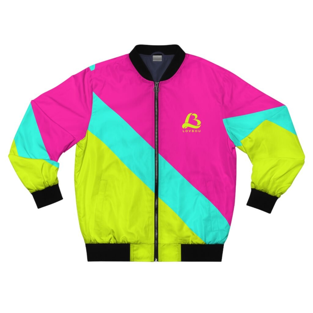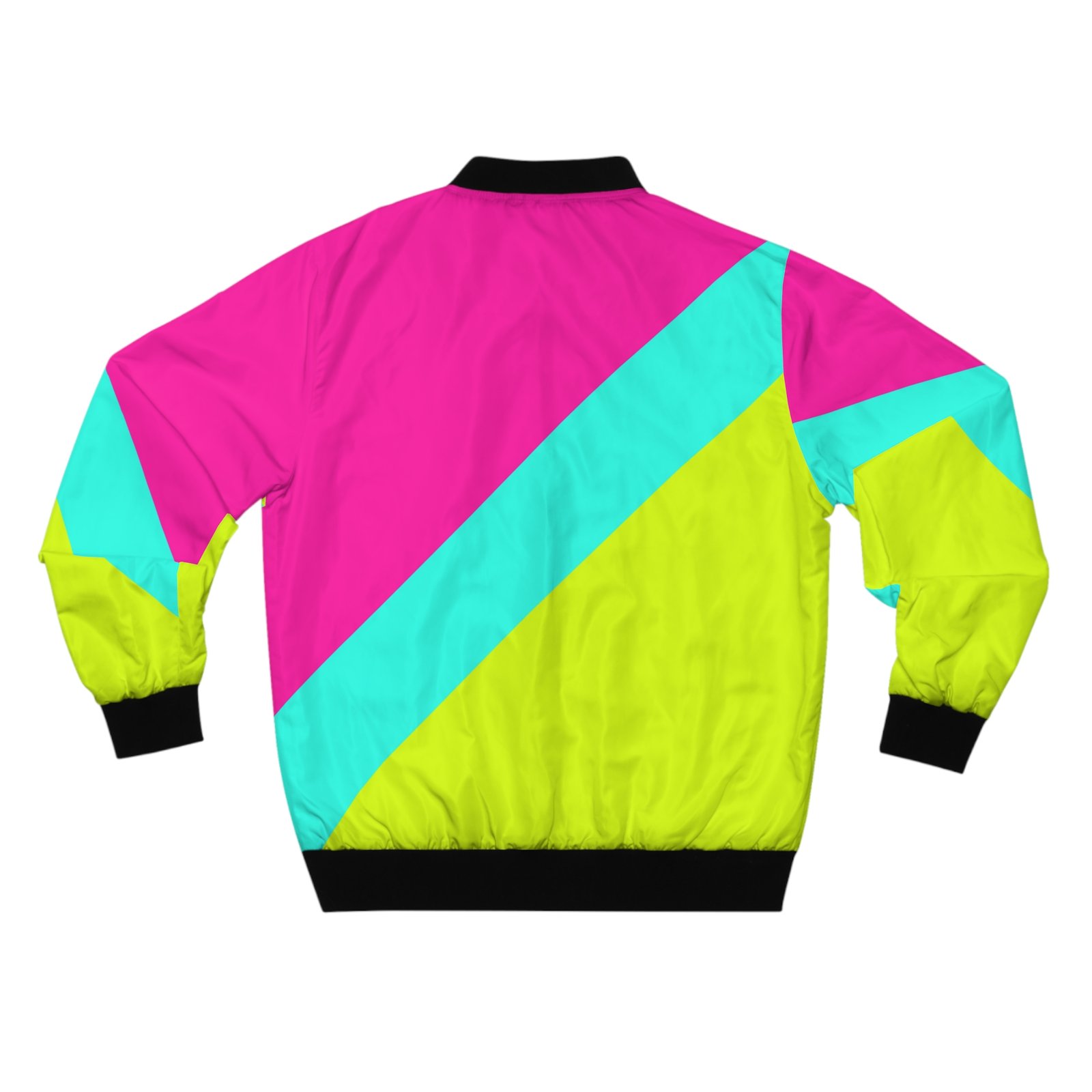 A striking retro-inspired bomber that brings vivid color and bold geometry to everyday wear. Lightweight yet wind-resistant polyester keeps the feel casual and sporty while the all-over diagonal blocks of neon pink, aqua, and chartreuse make a loud, confident statement. Black rib-knit collar, cuffs, and hem frame the silhouette and add contrast. Slip hands into the angled side pockets or zip up the metal front closure when the breeze picks up. Wear this jacket while cruising city streets, spinning through a late-night skate session, or layering over a graphic tee for a night out — it’s for people who want their outerwear to be playful, upbeat, and unmistakably visible.